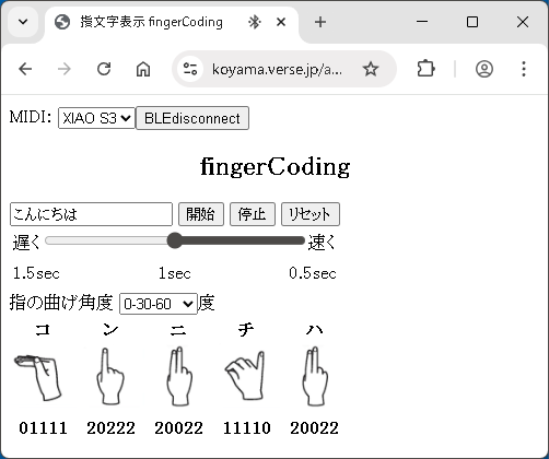 なお、スライダーで指文字表示の時間間隔(0.5~1.5秒)と、指の曲げ角度(0-30-60, 0-45-90, 0-60-120)を設定できます。