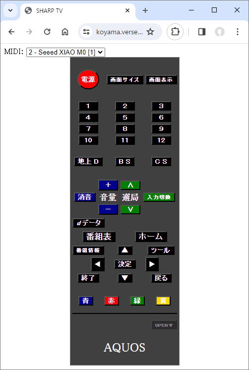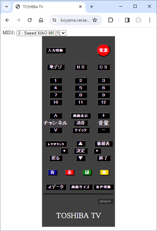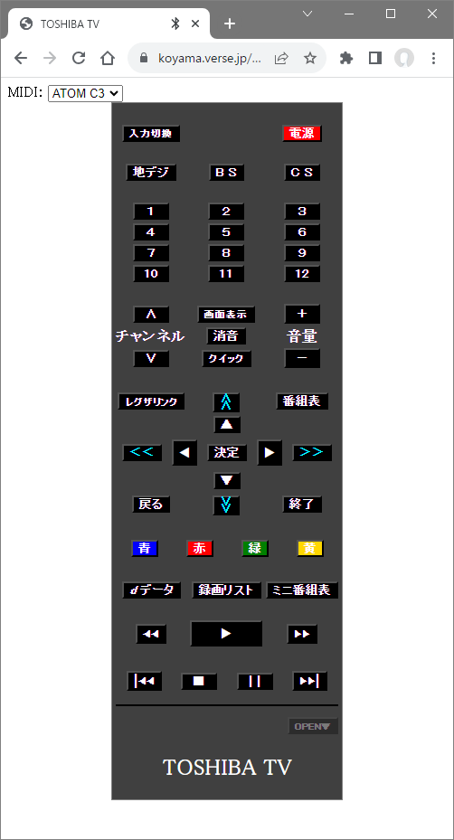 以下は「東芝テレビ用簡易リモコン」の表示画面で、ボタンを押すとリモコンデバイスからリモコン信号が送信されます。