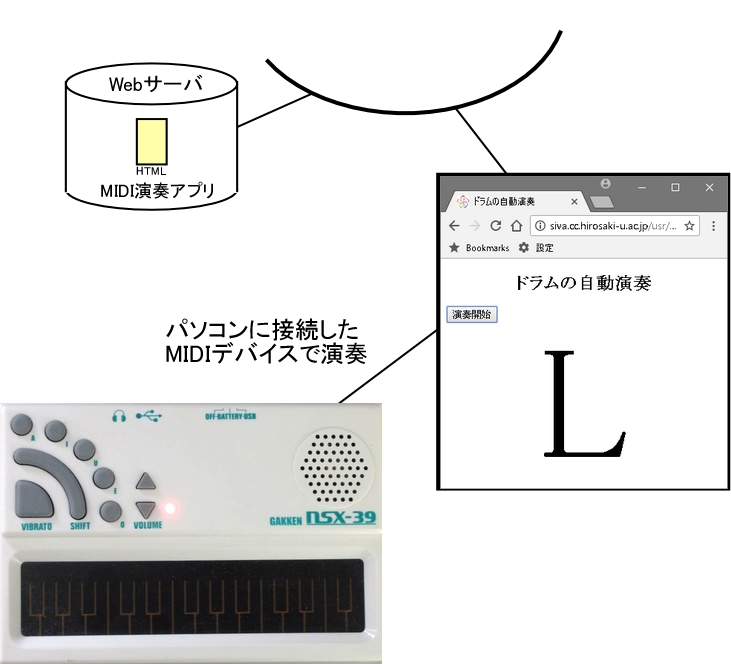 Web技術の進歩により、最近ではパソコンに接続したMIDIデバイスで演奏するWebページが作れるようになりました(下図)。