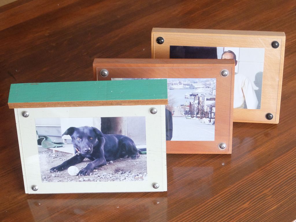 材料は、主に捨てられていた木製棚の棚板(18~24mm厚の単板で材質はさまざま)を利用しましたが、愛犬クロ(2000-2015)の写真立ては、長年クロが暮らした小屋の一部を使って作りました。身の回りに利用できそうな板材はたくさん見つかると思います。