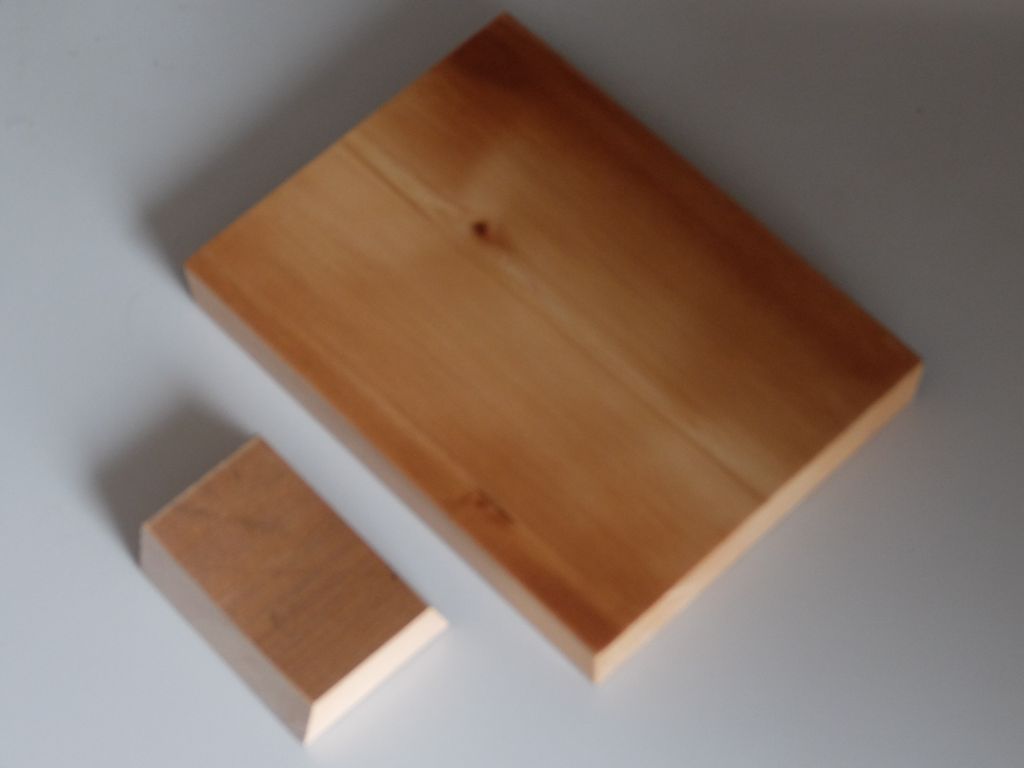 廃材を切断し、表面および側面を紙ヤスリできれいに磨き、ニスまたはクリヤーラッカーで塗装します(2度塗り)。 |